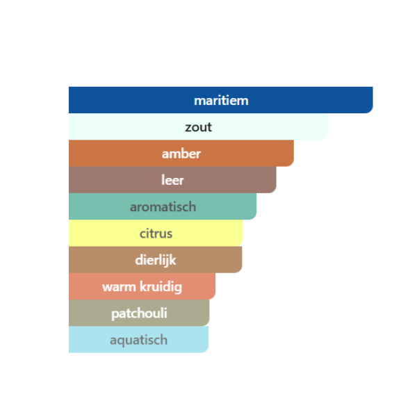 Topnoten zijn zout en mandarijn; hartnoten zijn maritieme noten, leer en jasmijn; basisnoten zijn amber, benzoë, patchouli en musk.
